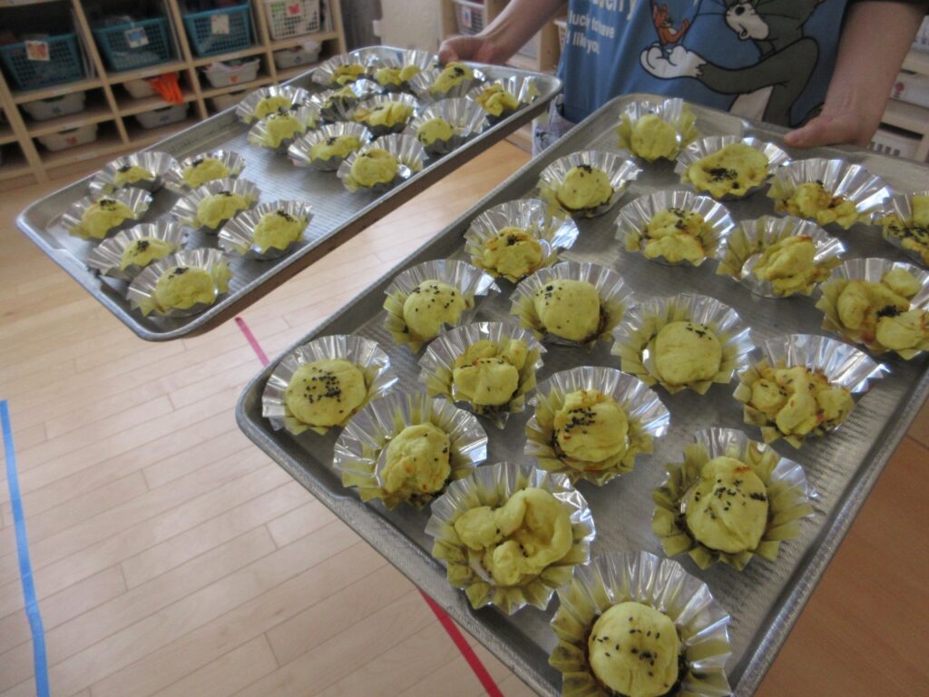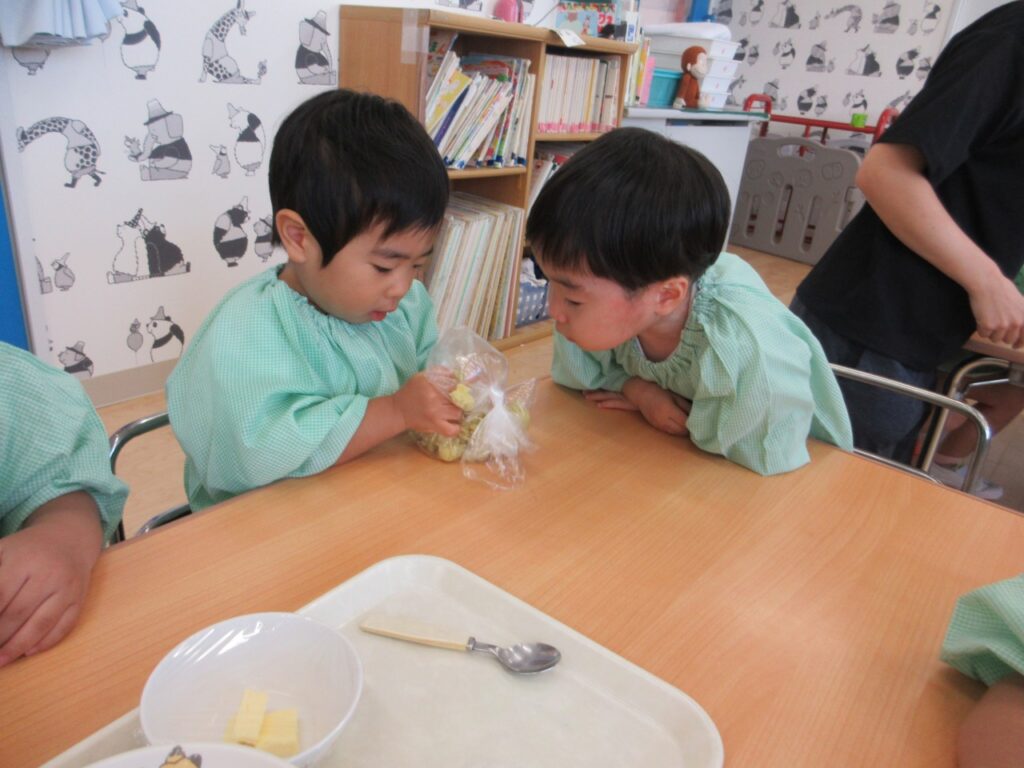蒸したお芋は「やわらかい~!」と感触や変化を楽しみながら潰しました。