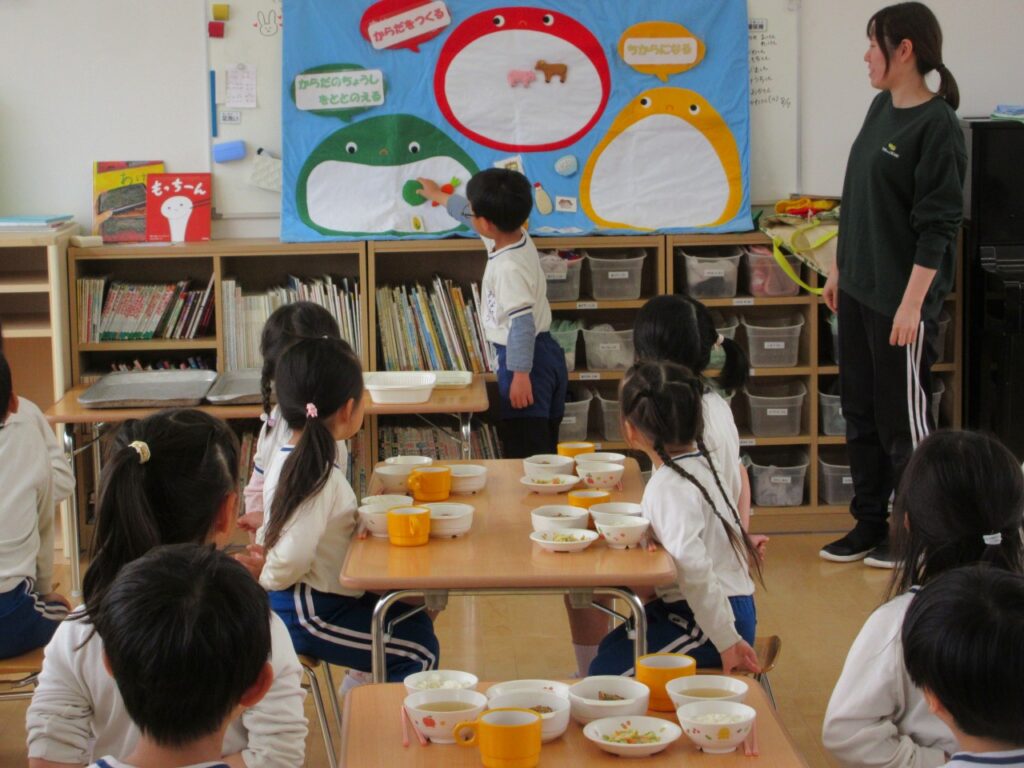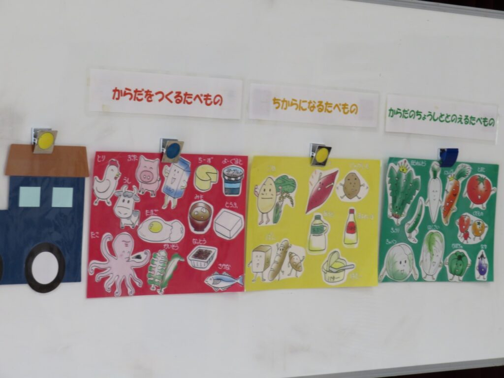 給食前には、ゆりぐみのお部屋で、その日の給食の食材を色わけしました。