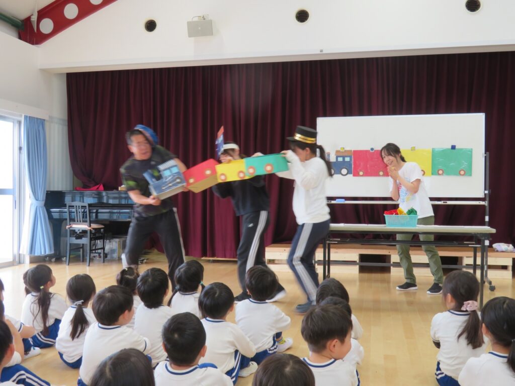 緑色の車両には、「からだの調子を整えるたべもの」野菜、果物、きのこをたくさん積みました。