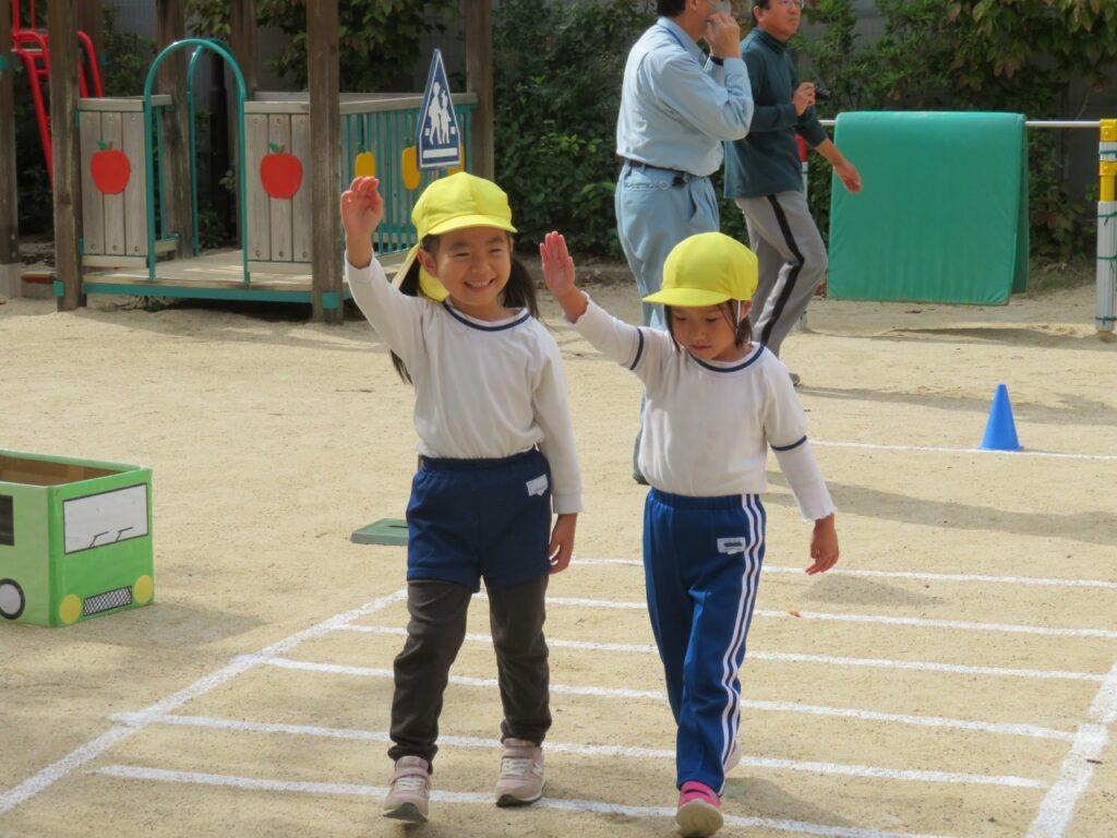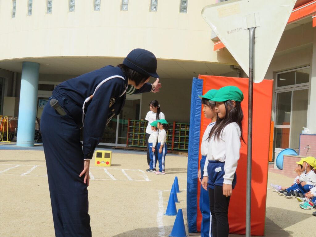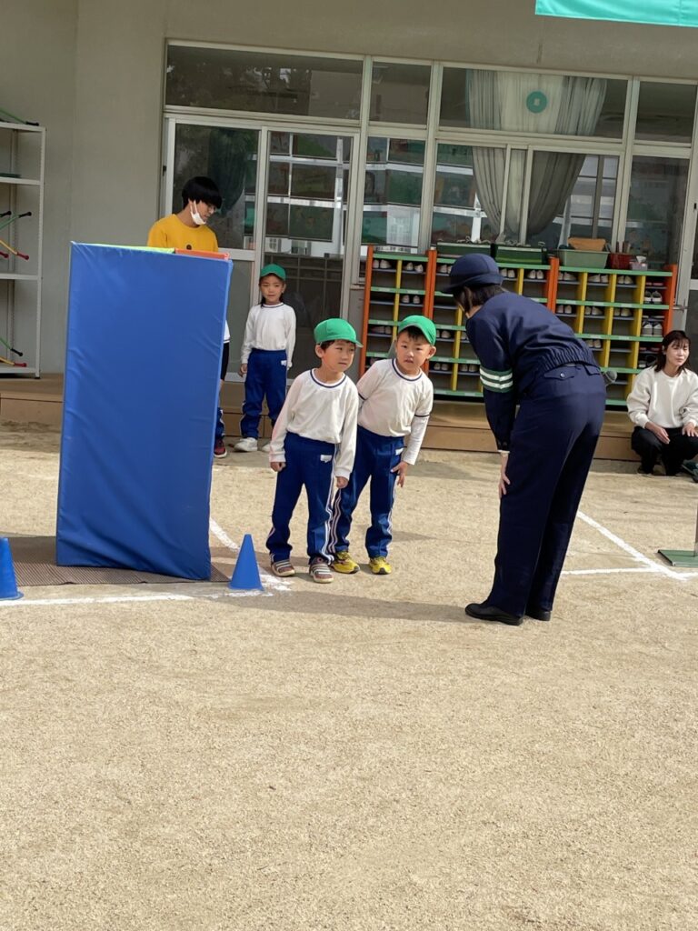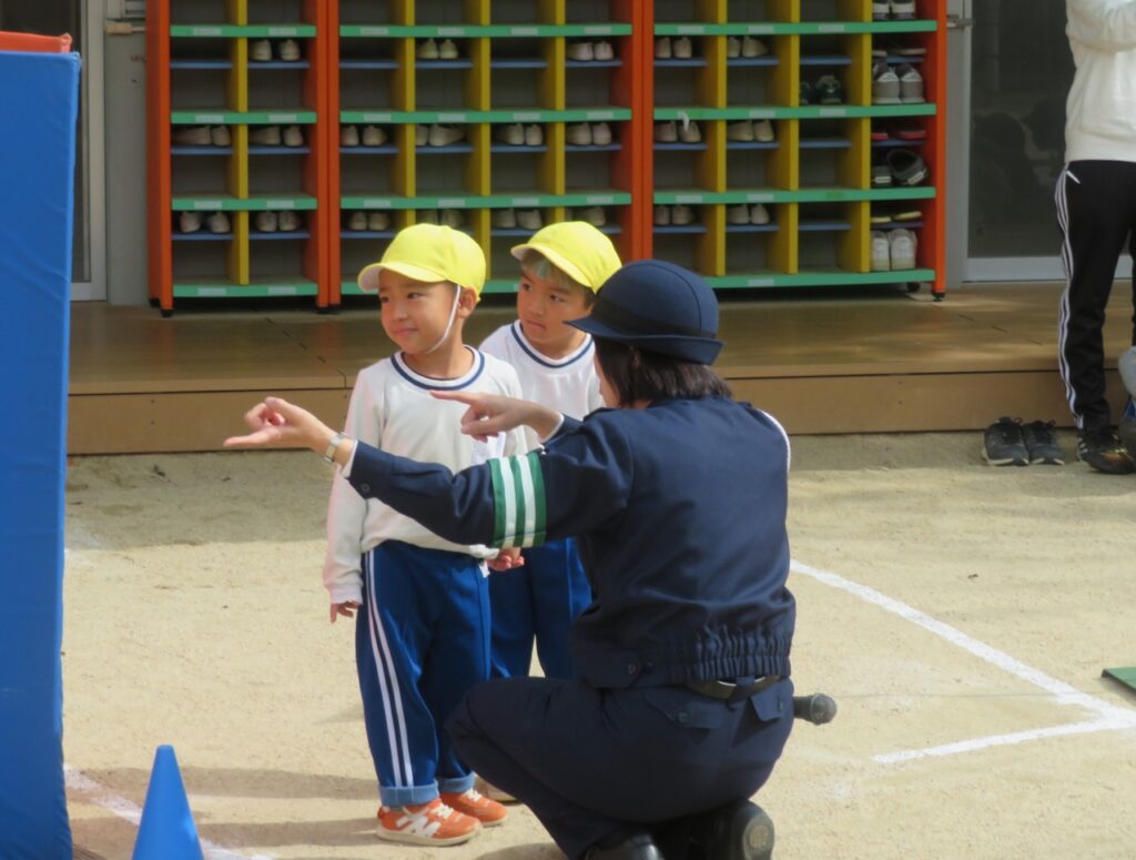 その後、警察の方に指導してもらい、園庭の模擬道路で実地訓練をしました。