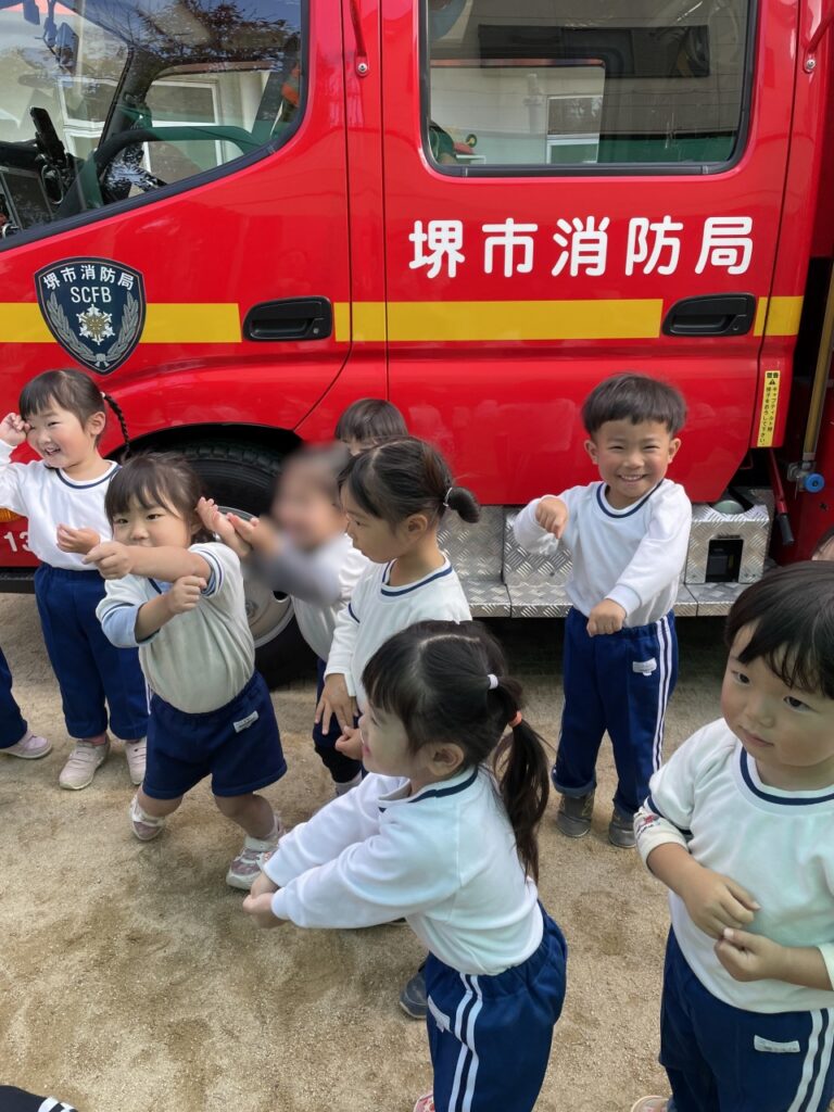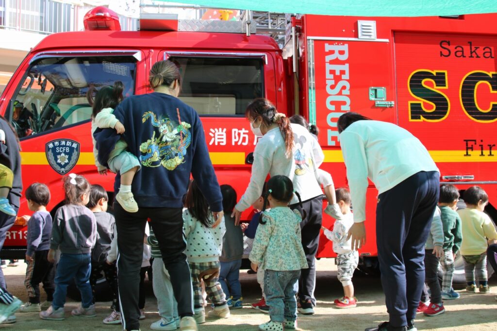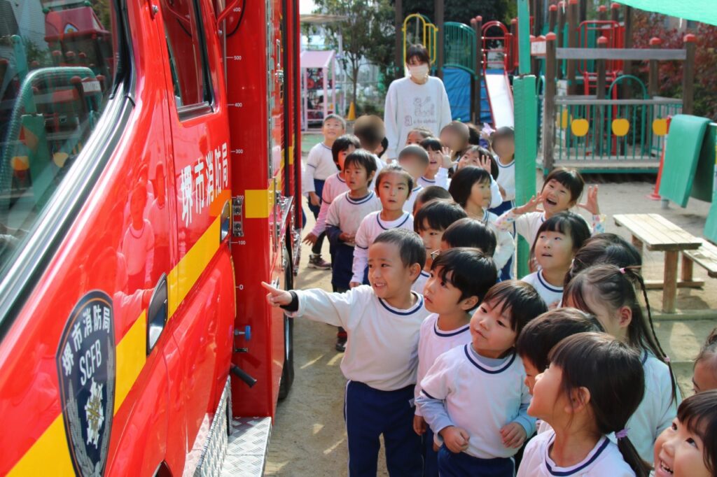 園庭に避難すると消防車が止まっていて、興味津々の子どもたち。