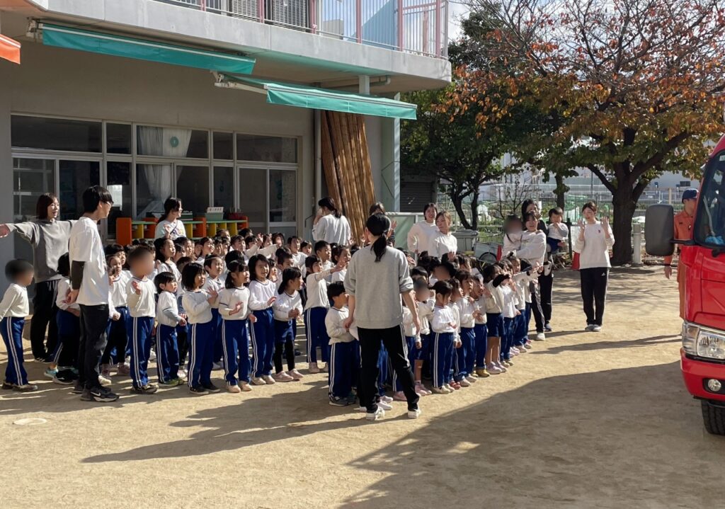 たくさんのことを教えてくださった消防士さん。最後はしっかりとお礼を伝えて消防士さんたちと消防車を見送る子どもたちでした。