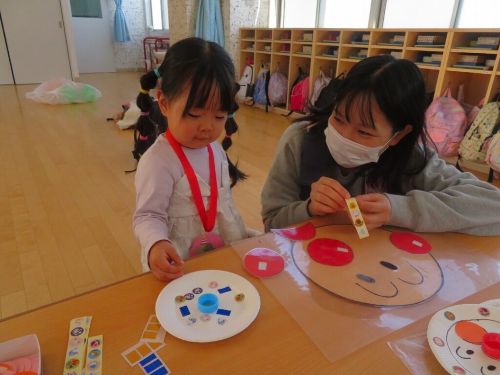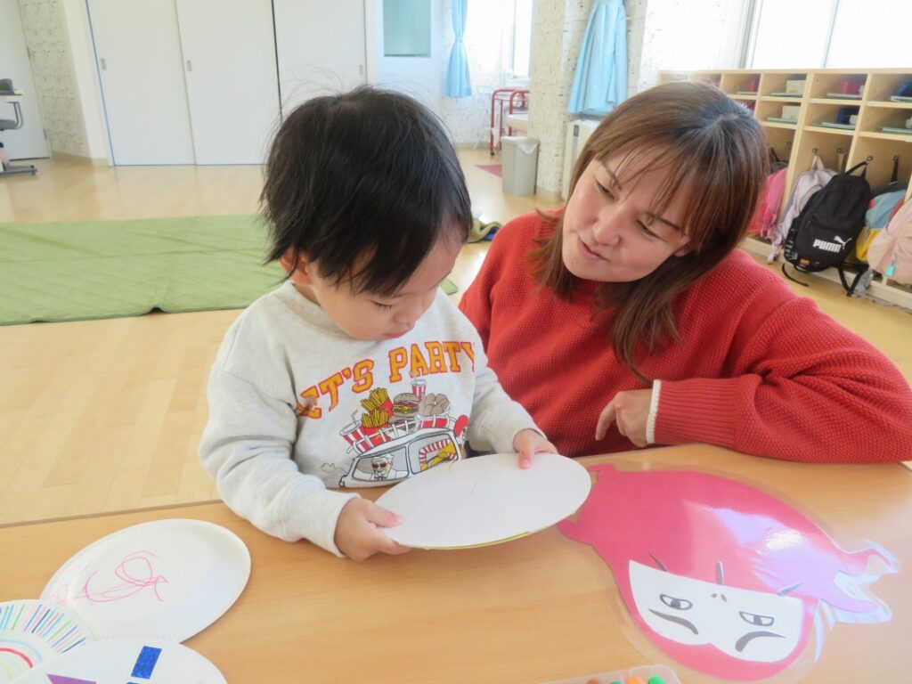 お正月遊びでは、福笑いをしたり、手作りのコマを作ったりして楽しみましたよ。