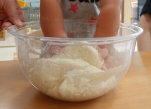 両手を使って力いっぱいこねたり、生地の上で足踏みしたり、、、